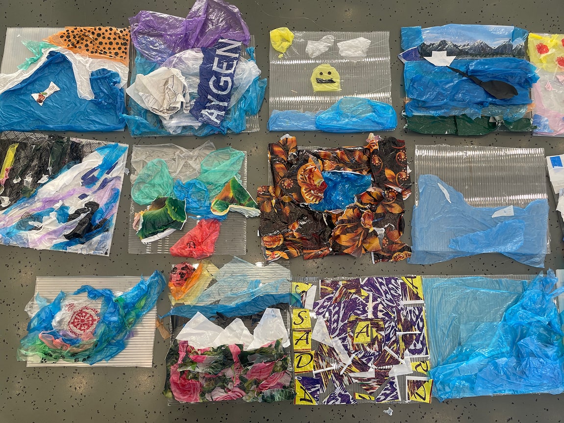 Participants are invited to bring blue, turquoise, purple, green, and white plastic bags—any that are associated with water. During the class, Saule Suleimenova will prepare identical templates that can be used to cut out elements from these bags and assemble your own composition on thick plastic film.