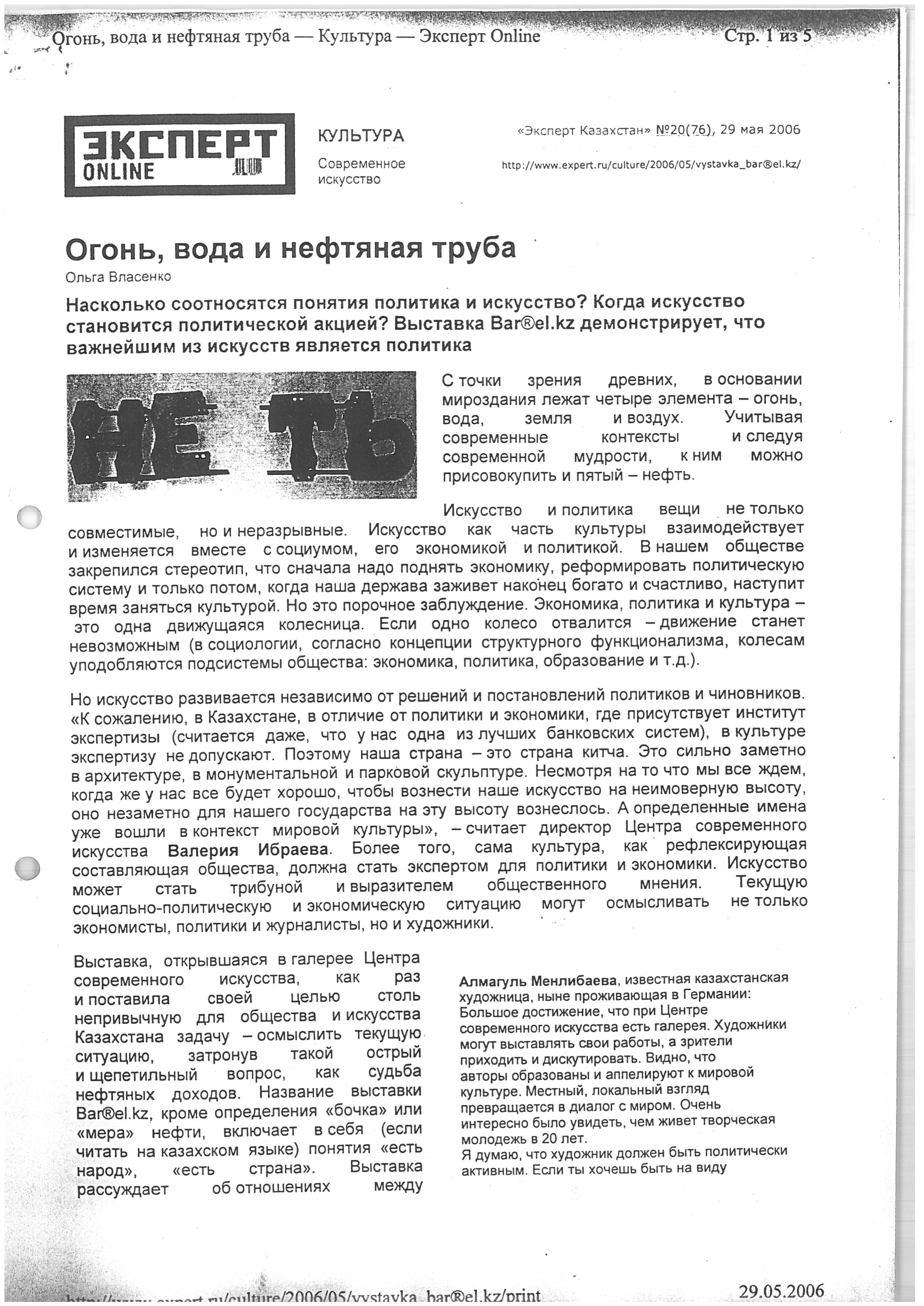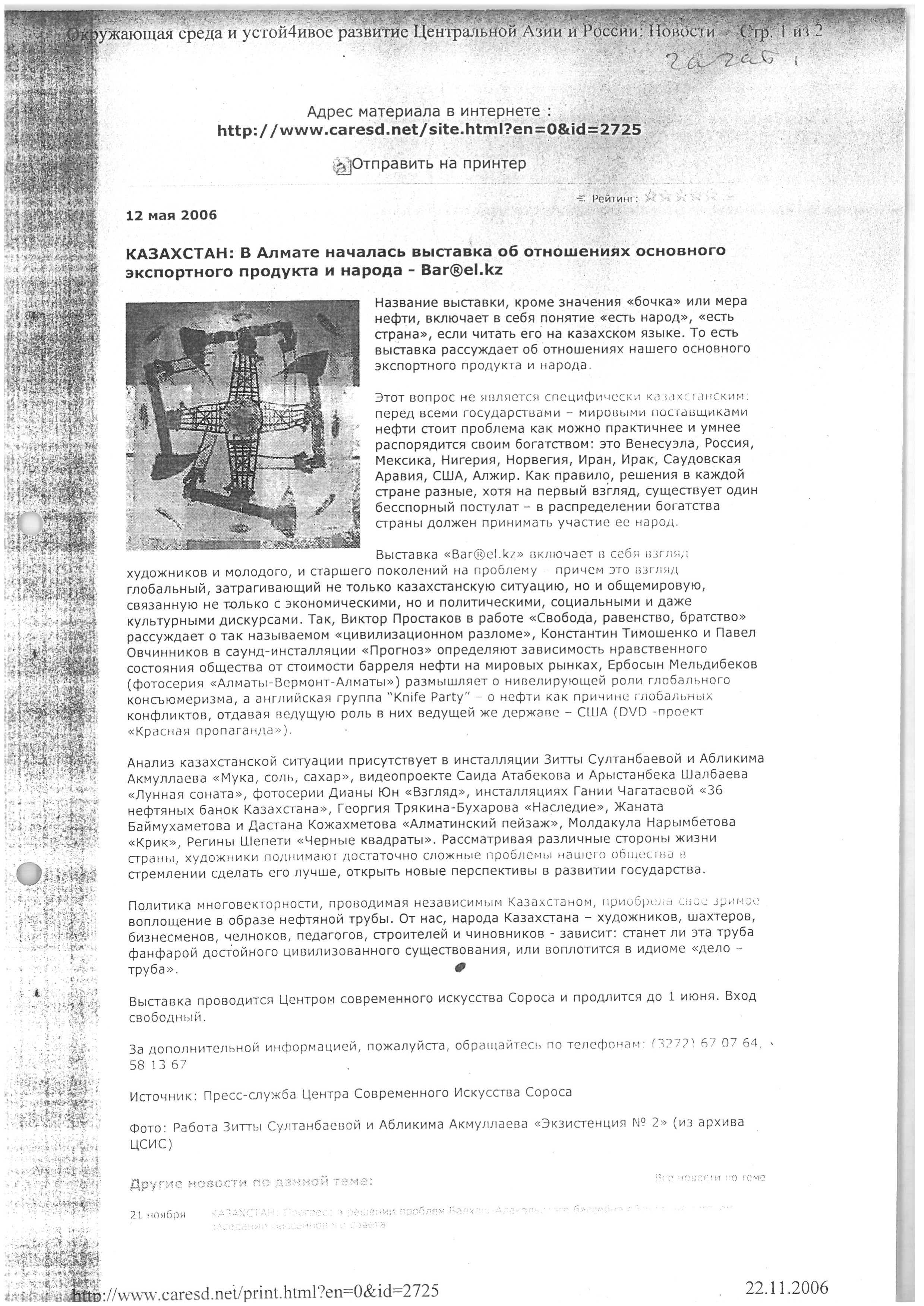 Author unknown. "KAZAKHSTAN: An exhibition on the relationship between the main export product and the people has opened in Almaty - Bar®el.kz." 2006.