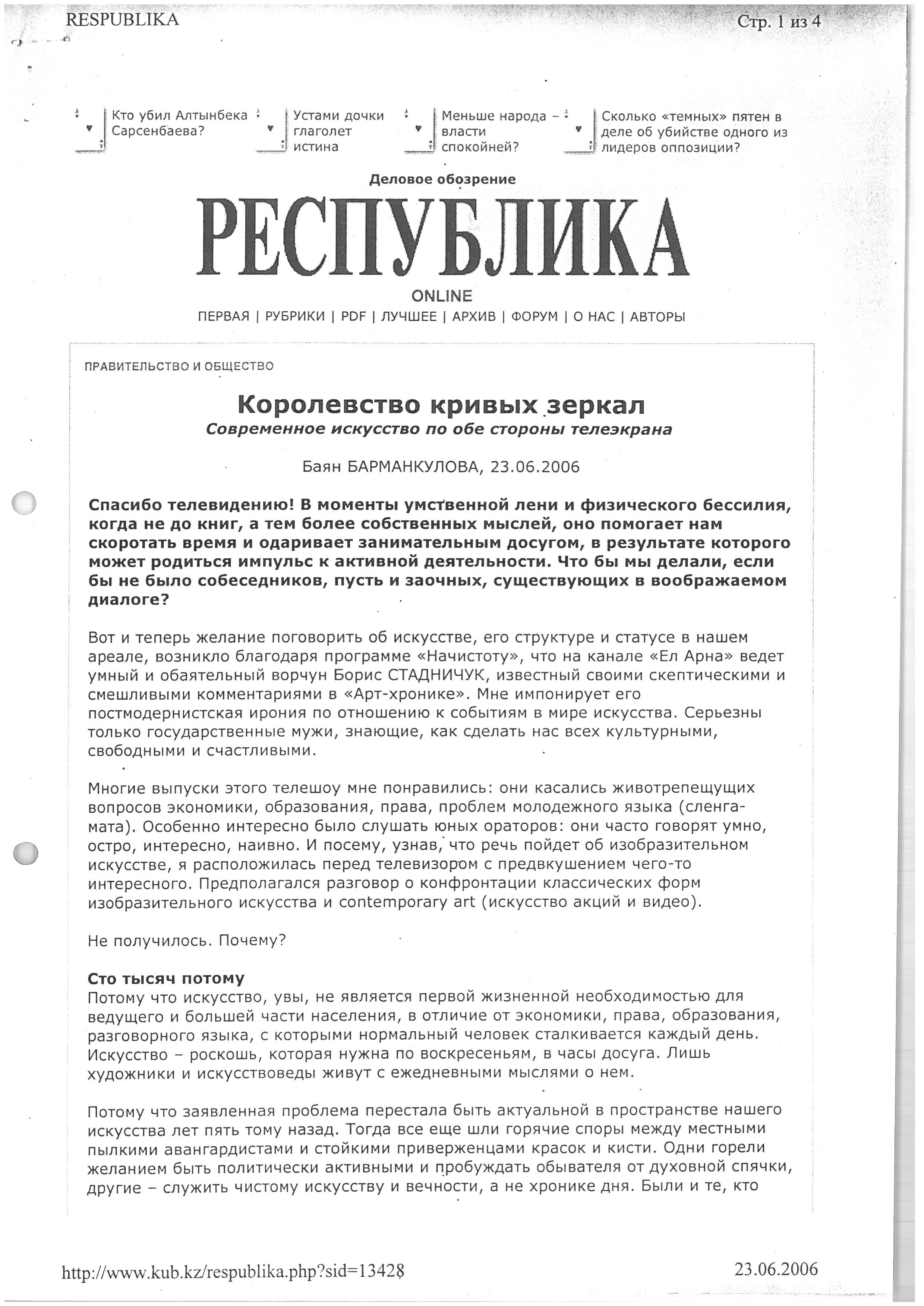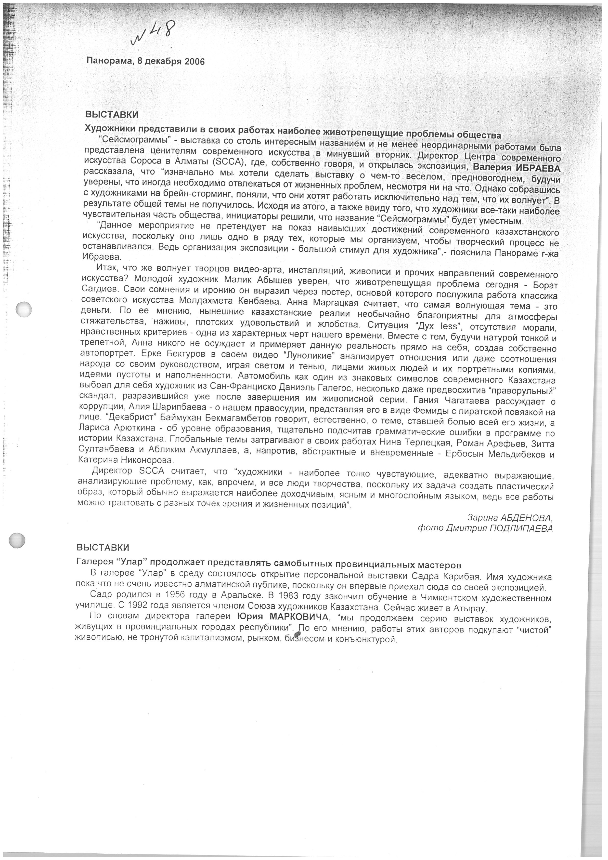 Abdenova, Z. "EXHIBITIONS. Artists presented the most pressing issues of society in their works"; "EXHIBITIONS. The 'Ular' Gallery continues to showcase distinctive provincial artists." 2006.