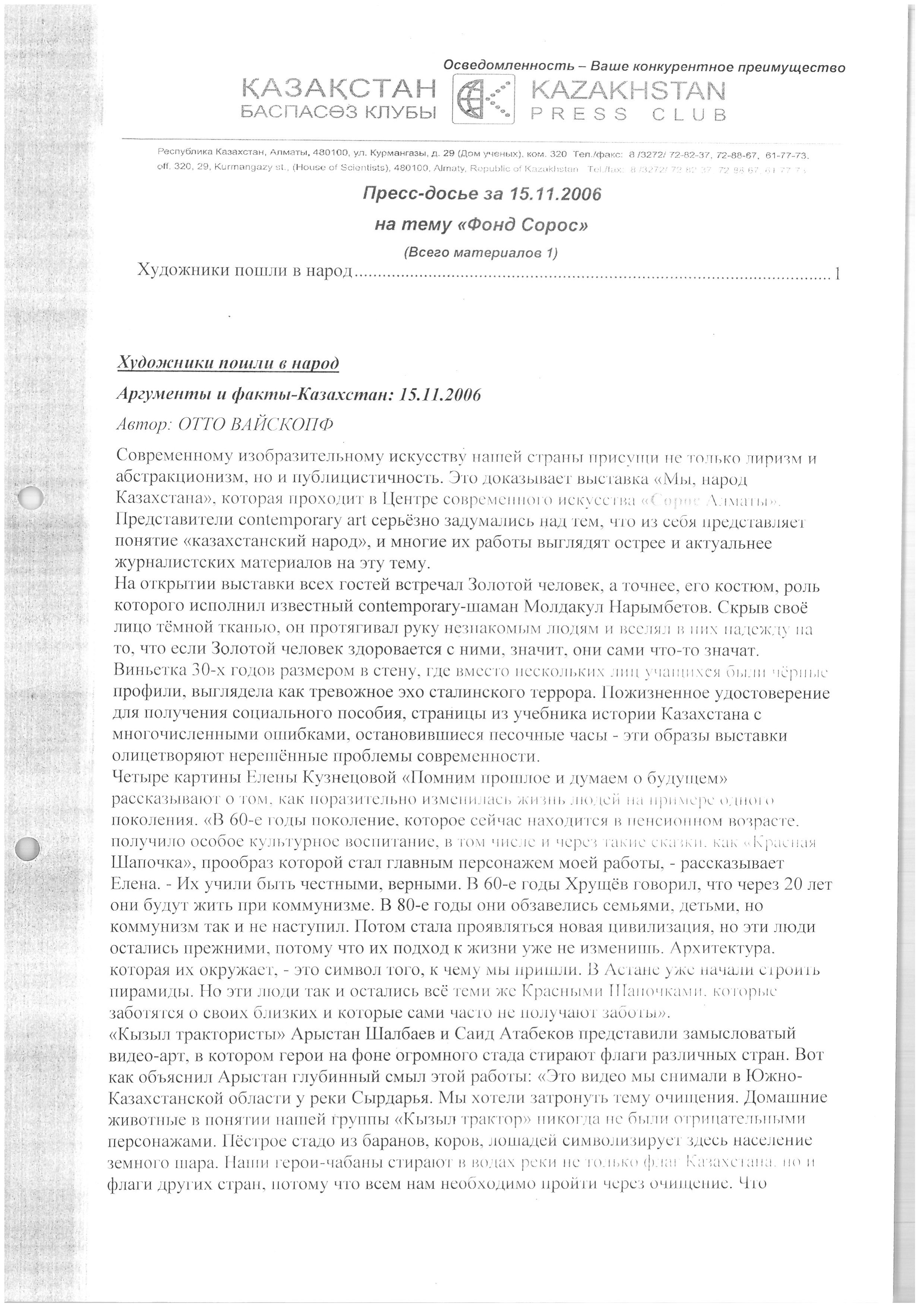 Vaikopf, O. "Press dossier for November 15, 2006 on the topic 'The Soros Foundation'"/'Artists went to the people.'" 2006.