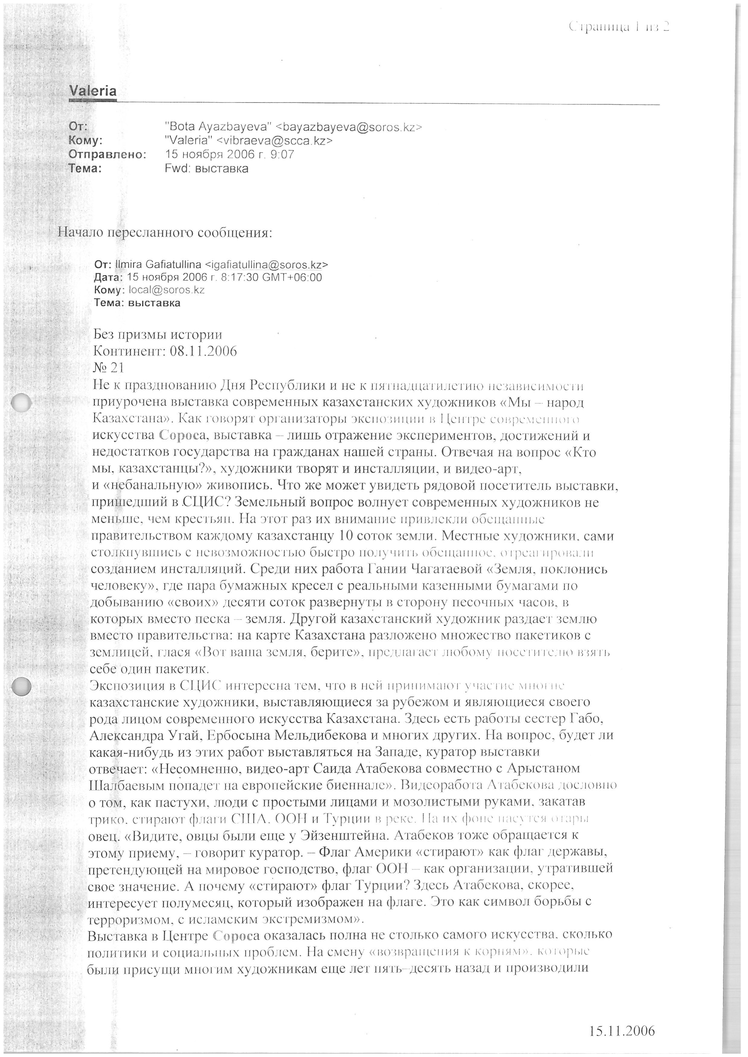 Ayazbayeva, B. "Exhibition Untitled ('Without the Prism of History')." 2006.