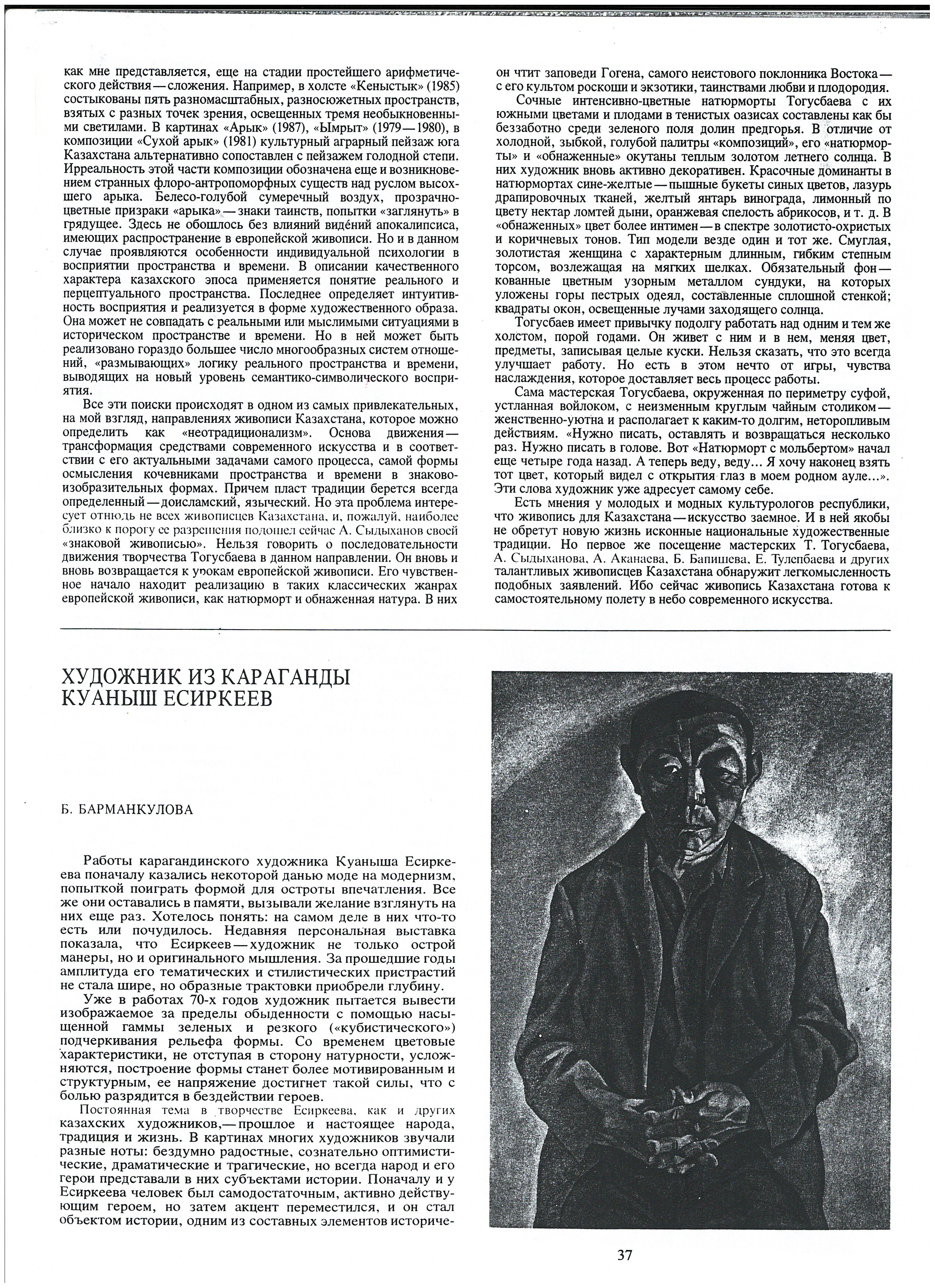 Barmankulova, B. "The Artist from Karaganda, Kuanysh Esirkeev." 1990.
