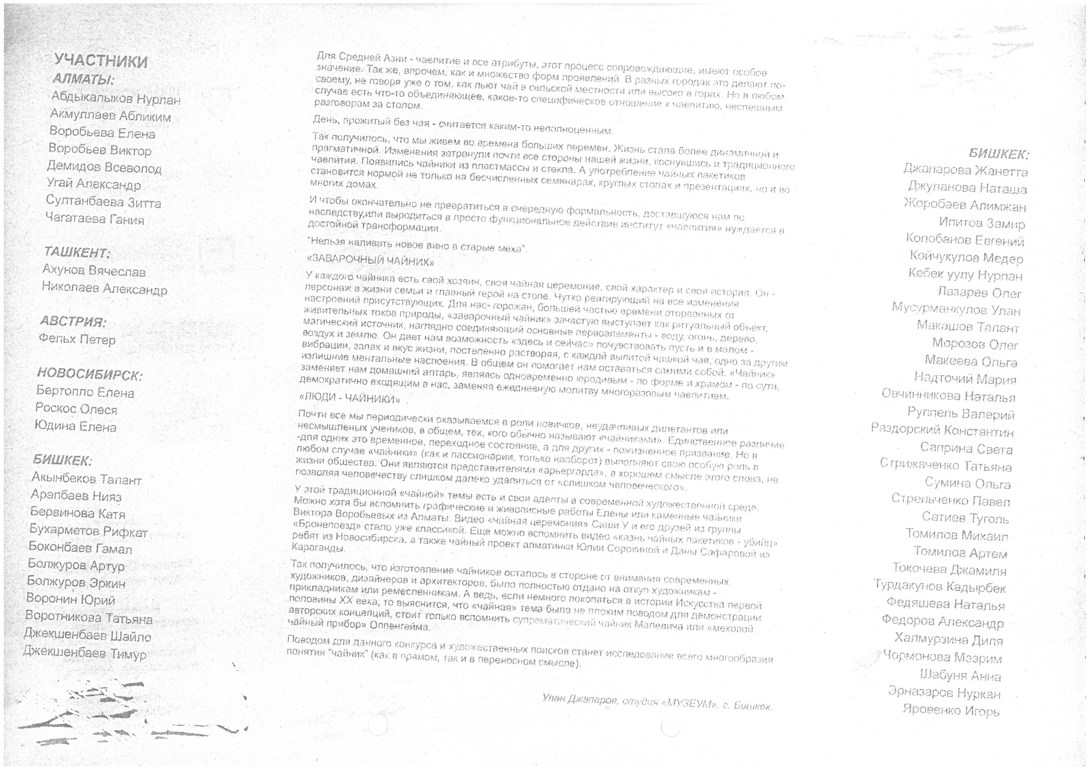 Abdykalykov Nurlan, Akmullaev Ablikim, Akynbekov Talant, Amvrosova Margarita, Arapbaev Niyaz, Akhunov Vyacheslav, Bervinova Katya, Bertollo Elena, Bokonbaev Gamal, Bolzhurov Erkin, Bukharmetov Rifkat, Vorobyov Viktor, Vorobyova Elena, Voronin Yuri, Vorotnikova Tatiana, Group "Bronepoezd," Demidov Vsevolod, Dzaparov Ulan, Dzaparova Zhanetta, Dzhekshenbaev Timur, Dzhakshanbaev Shailo, Dzhulanova Natasha, Ezhenova Nazipa, Zhorobaev Alimzhan, Ipitov Zamir, Kebek uulu Nurlan, Koychukulov Meder, Kolobanov Evgeny, Lazarev Oleg, Makashov Talent, Makeeva Olga, Malevich Kazimir, Morozov Oleg, Musurmankulov Ulan, Nadtochiy Maria, Nikolaev Alexander, Ovchinnikova Natalia, Orozumbekov Valery, Razdorsky Konstantin, Roskos Olesya, Ruppel Valery, Saprina Sveta, Sarulu Marat, Satiev Tugol, Safarova Dana, Sorokina Yulia, Strelchenko Pavel, Strizhachenko Tatiana, Sultanbaeva Zita, Sumina Olga, Tokocheva Jamila, Tomilov Artem, Tomilov Mikhail, Turdakunov Kadyrbek, Ugaev Alexander, Fedorov Alexander, Fedyasheva Natalia, Felch Peter, Khaltmurzina Dily, Chagatayeva Ganiya, Chormonova Meirim, Shabunya Anna, Ernazarov Nurkan, Yudina Elena, Yarovenko Igor.