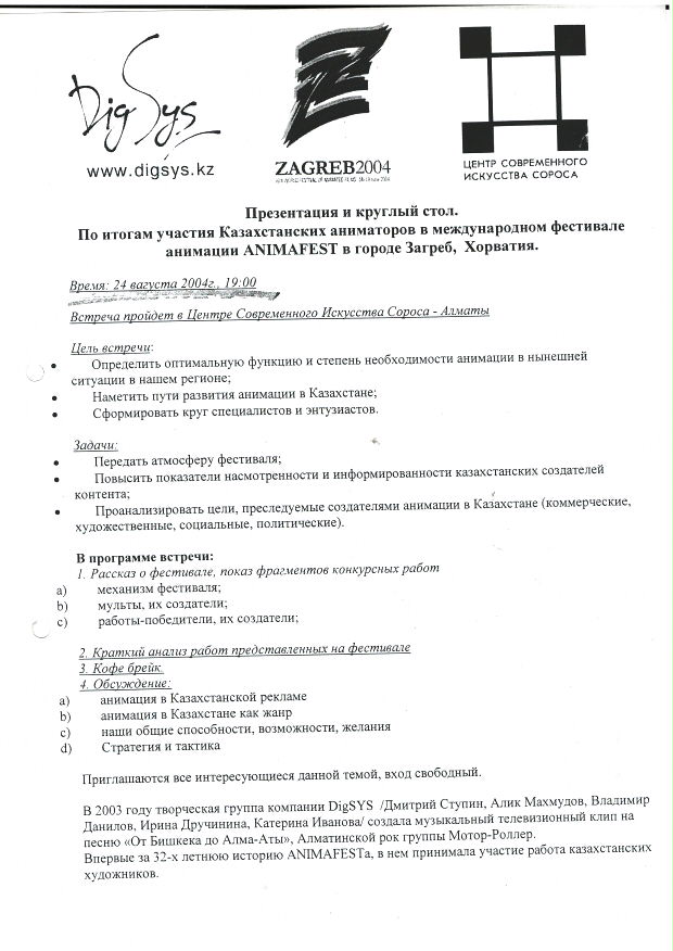 Author unknown. "Presentation and round table. Following the participation of Kazakh animators in the ANIMAFEST international animation festival in Zagreb, Croatia." 2004.