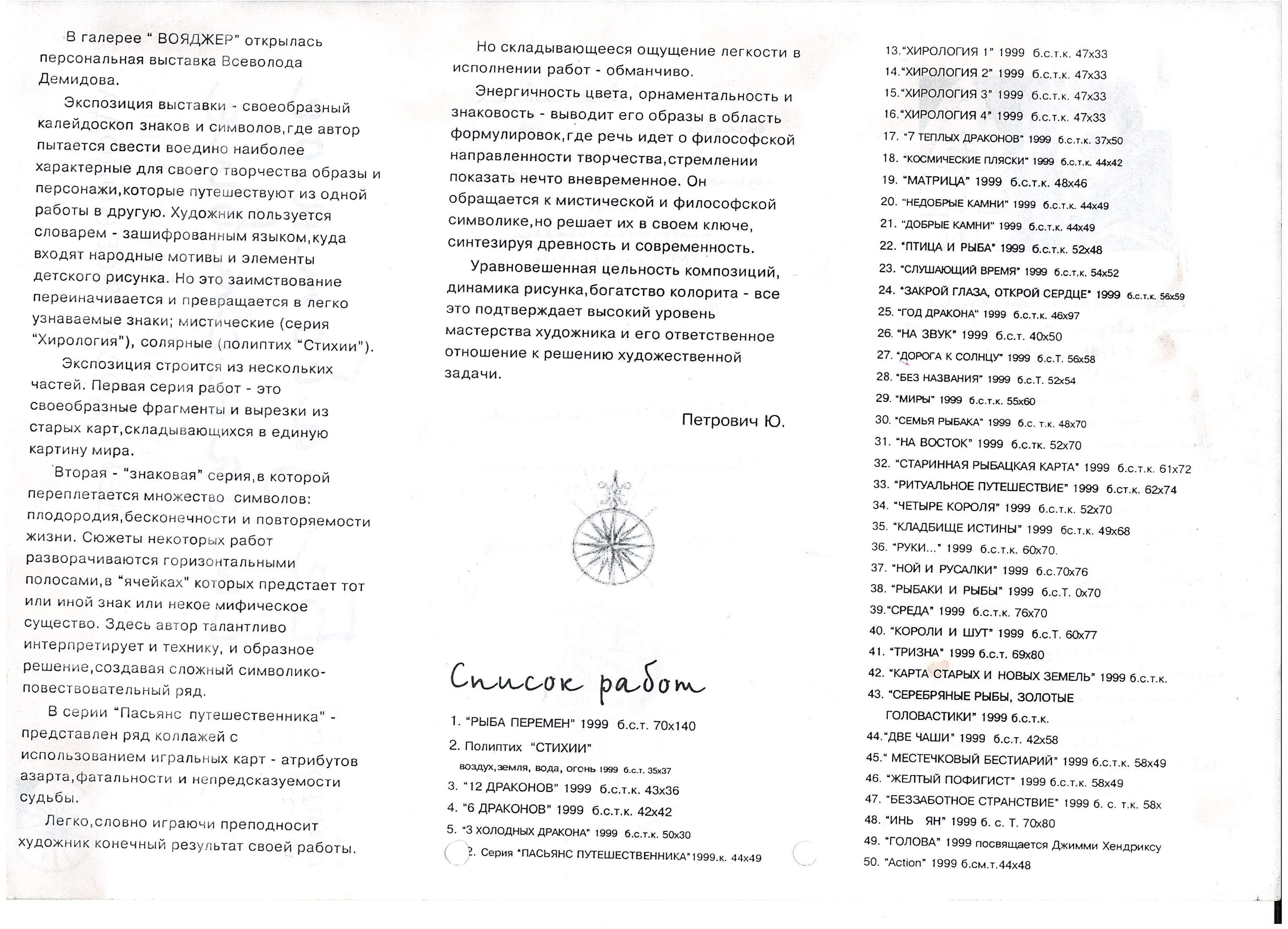 Demidov, V. Totem. 1993. Fiberboard, cement, oil. 60x49. Demidov, V. Large Stool. 1994. Canvas, oil. 90x86. Demidov, V. Thirst for Wind. 1994. Canvas, oil. 62x66. Demidov, V. "Green World." 1994. Canvas, oil. Demidov, V. "Masquerade." 1994. Canvas, oil. 83x77. Demidov, V. "Mask-Faces." 1994. Canvas, oil. 81x91. Demidov, V. "Musician." 1994. Canvas, oil. 38x46.5. Demidov, V. "Turtle." 1994. Canvas, oil. 86x79. Demidov, V. "Head." 1995. Canvas, oil. 35x27. Demidov, V. "Yellow Garden." 1995. Canvas, oil. 29x29. Demidov, V. "Zebras." 1995. Canvas, oil. 84x124. Demidov, V. "Snakes Over the City." 1995. Oil on canvas. 94x84. Demidov, V. "Game Without Rules." 1995. Oil on canvas. 108x98. Demidov, V. "The Ladder of Eternity." 1995. Oil on canvas. 64x84. Demidov, V. "Still Life on Red." 1995. Oil on canvas. 25x34. Demidov, V. "Firefighters. Fighting Fire." 1995. Oil on canvas. 85x109. Demidov, V. "Travelers." 1995. Oil on canvas. 74x104. Demidov, V. "Gardener and His Son." 1995. Oil on canvas. 63x44. Demidov, V. "Black Village." 1995. Oil on canvas. 85x105. Demidov, V. Houses in the Garden. 1995. MDF, oil. 27x27. Demidov, V. Untitled. 1996. Canvas, oil. 85x100. Demidov, V. Cheerful Little Boat. 1996. Canvas, oil. 35x35. Demidov, V. "Big Boat." 1996. Canvas, oil. 65x85. Demidov, V. "In the Center of Events." 1996. Canvas, oil. 51.5x64. Demidov, V. "City D." 1996. Canvas, oil. 42x52. Demidov, V. "Trees." 1996. Gauze on fiberboard, oil. 26.6x33. Demidov, V. "Houses in the Garden." 1995. Canvas on fiberboard, oil. 27x27. Demidov, V. "Houses. Fences. Smoke." 1996. Oil on canvas. 41x39.5. Demidov, V. "Yellow Boat." 1996. Oil on canvas. 49x83. Demidov, V. "Golden Steamboat." 1996. Canvas, oil. 85x124. Demidov, V. "Ship." 1996. Canvas, oil. 50x80. Demidov, V. "Sun Ship." 1996. Canvas, oil. Demidov, V. "Stairs." 1996. Canvas, oil. 385x33. Demidov, V. Masks. 1996. Canvas, oil. 635x665. Demidov, V. Meis of Two Suns. 1996. Canvas, oil. 87x113. Demidov, V. Obsessive Idea. 1996. Canvas, oil. 74x85. Demidov, V. "Still Life with Glass." 1996. Canvas, oil. 28x45. Demidov, V. "Still Life with a Goldfish." 1996. Canvas, oil. 56x49. Demidov, V. "The Deceived King." 1996. Oil on canvas. 655x845. Demidov, V. "Wicker Boat." 1996. Oil on canvas. 42x60. Demidov, V. "Floating in the Sun." 1996. Canvas, oil. 54x42. Demidov, V. "The Last...". 1996. Canvas, oil. 90x80. Demidov, V. "Rhythms of City S". 1996. Canvas, oil. 42x52. Demidov, V. "Salute". 1996. Canvas, oil. 475x59. Demidov, V. "Old Boat." 1996. Canvas, oil. 34x49. Demidov, V. "Wandering Angels - Musicians." 1996. Canvas, oil. 285x45. Demidov, V. "Guarding the Barge." 1996. Oil on canvas. 57x93. Demidov, V. "Three in a Boat. Ship of Fools." 1996. Oil on canvas. 86x145. Demidov, V. "Triptych '9 Ships.'" 1996. Gouache, paper. 65x95 (9 pieces). Demidov, V. "Four Old Boats." 1996. Paper, ink, tea. 125x175 (4 pieces). Demidov, V. "Four Young Boats." 1996. Ink, pen, paper. 63x175 (4 pieces). Demidov, V. "Decorative Vessel." 1996. Ink, gouache, paper. 85x115 (4 pieces). Demidov, V. and Sotnikov, V. "Birdhouse." 1996. Canvas, oil. 67x97. Sotnikov, V. "Cake." 1995. Canvas, oil. 50x50. Sotnikov, V. "One-armed Icarus." 1992-1995. Mixed media, paper. 34x34. Sotnikov, V. "Street of Peace." 1996. Canvas, oil. 80x90. Sotnikov, V. "This is a puppeteer without a puppet." 1996. Canvas, oil. 80x100.