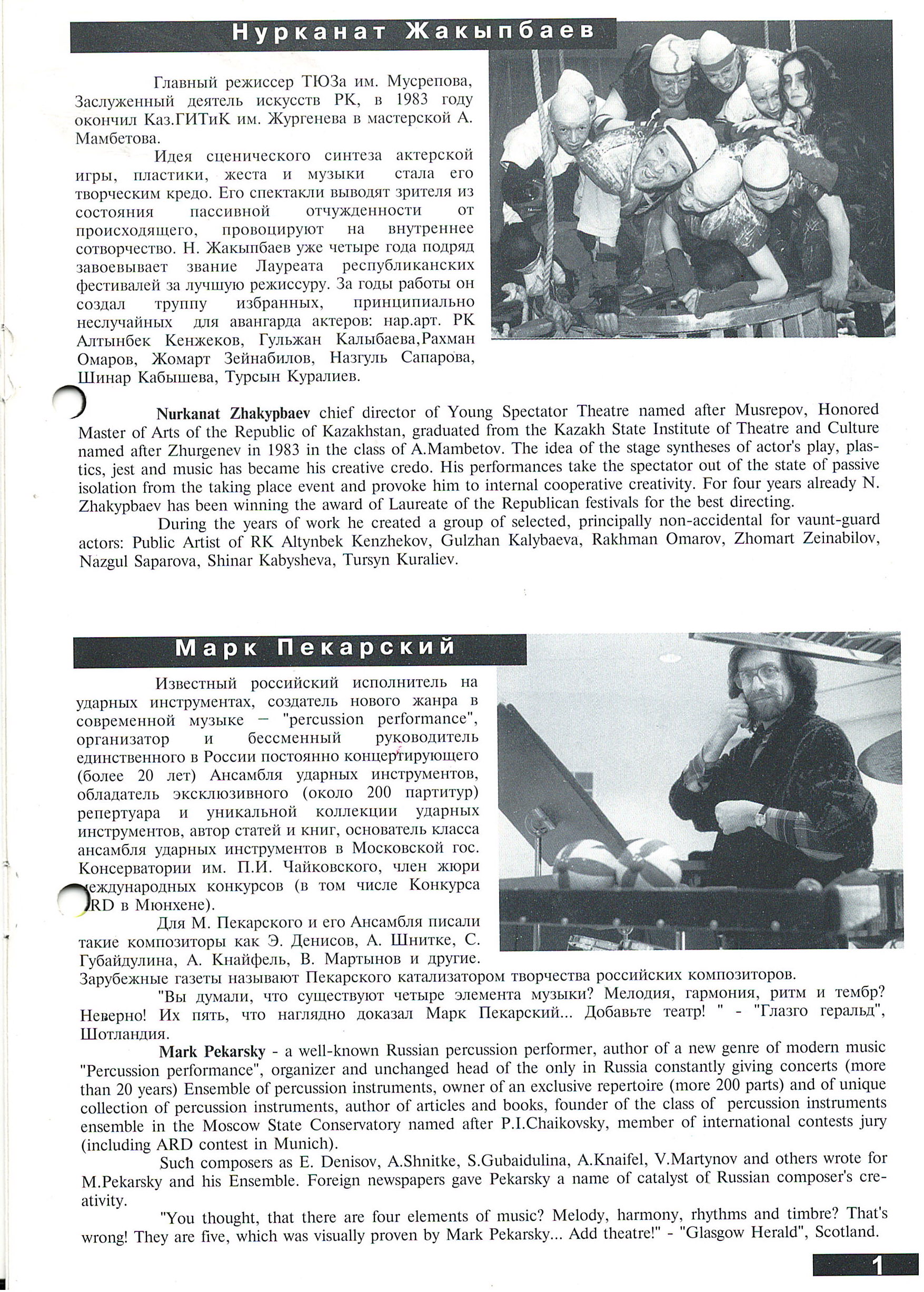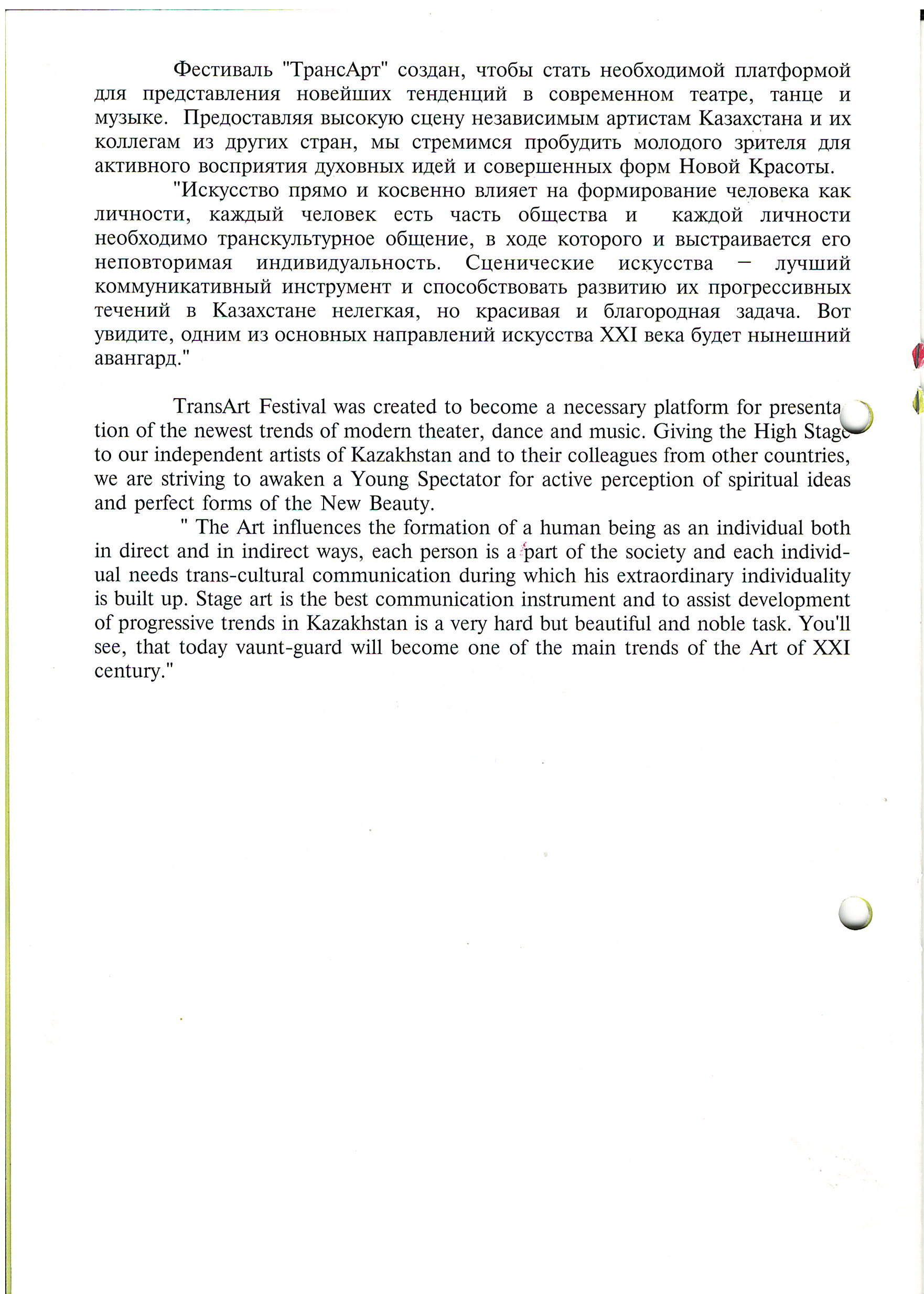 Author unknown. "First International Festival of Modern Stage Arts 'TransArt Festival'". 2000.