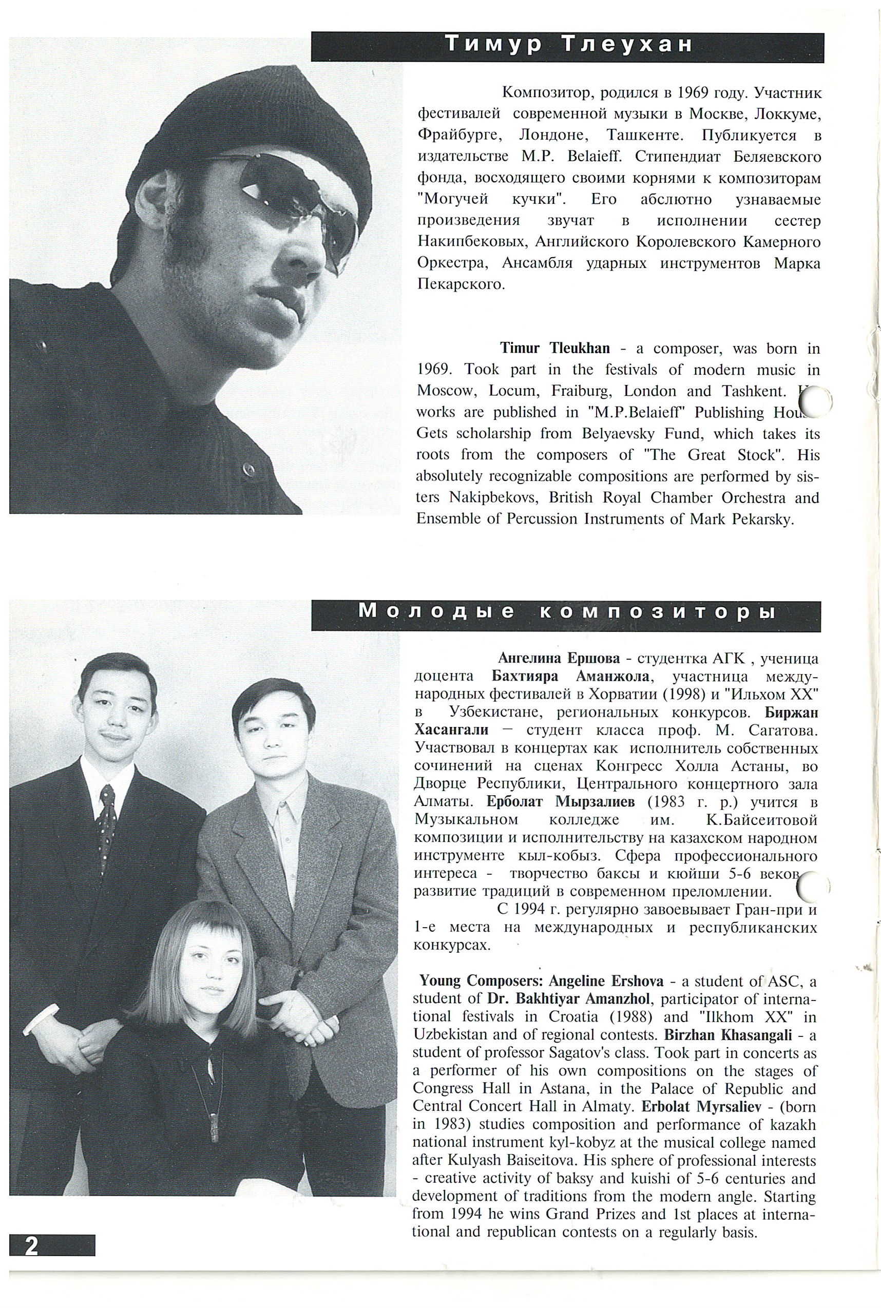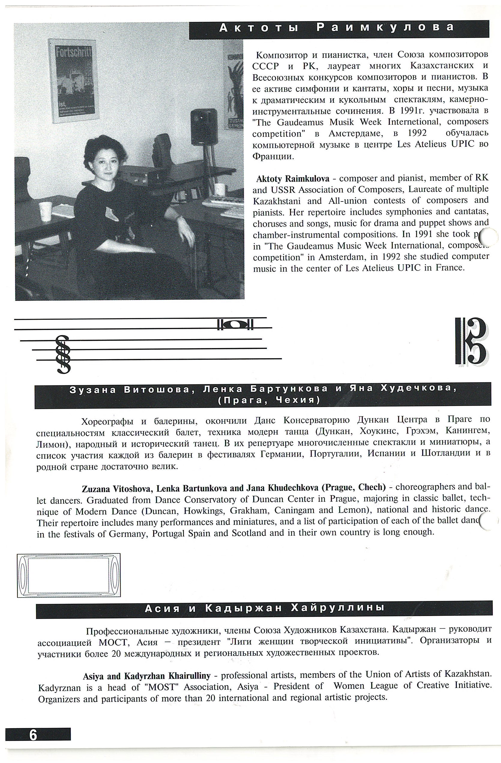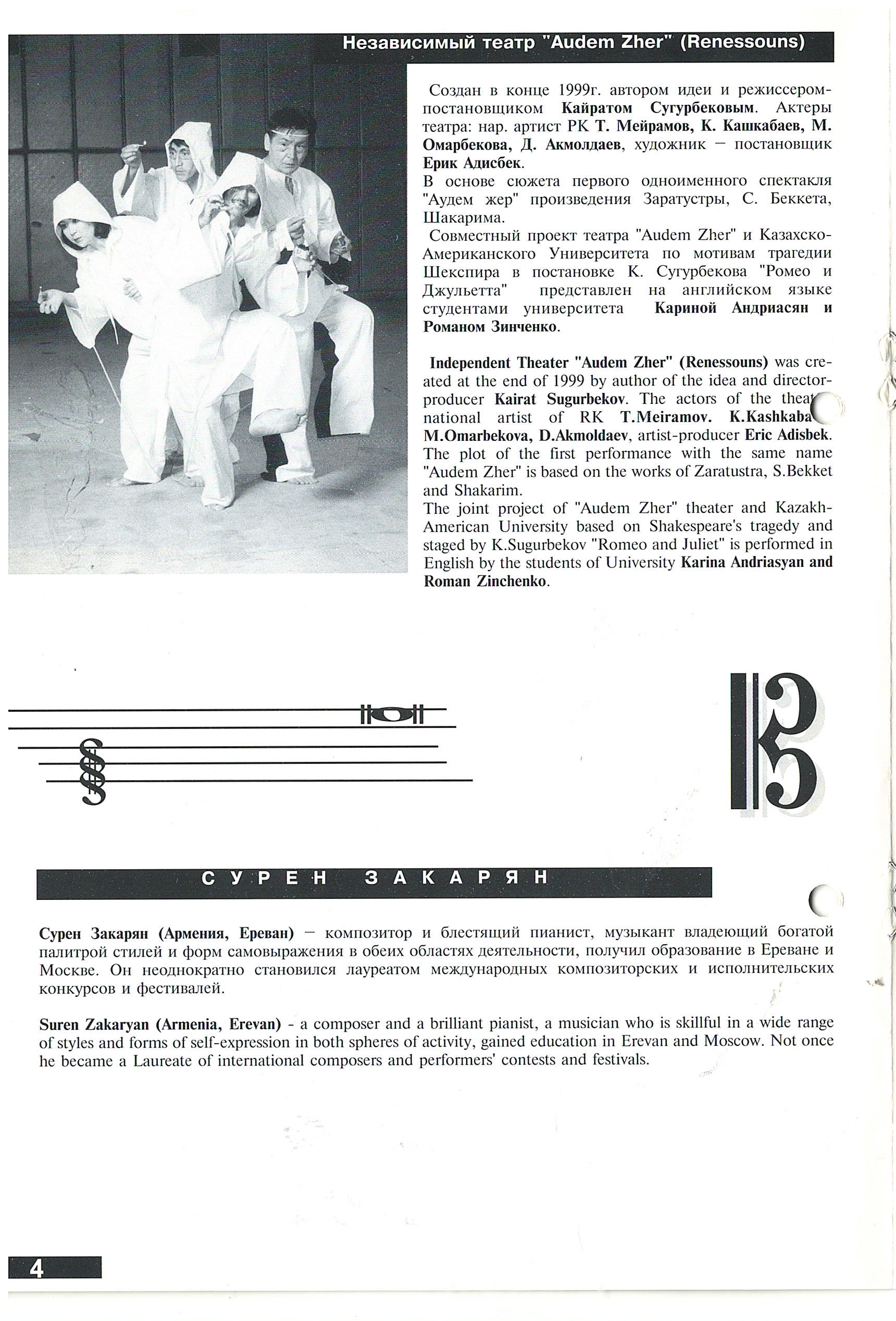 Abdinurov Alibi, Adamova Gulnara, Adisbek Erik, Akmoldaev D., Almaty Korean Percussion Group "Samulnori," Amanzhol Bakhtiyar, Andriasyana Karina, Association of Young Performers (AMI), Akhmetzhanova Togzhan, Baimagambetov Askhat, Bartunkova Lenka, Vitoshova Zuzana, Gabbasova Gulmira, Gabbasova Gulnara, Adam Group, Danilov Andrey, Dzheksembekova Zhanna, Dyusembaeva Madina, Enkebayeva Bereke, Ershova Angelina, Zhakybaev Nurkanat, Zakaryan Suren, Zeynabilov Zhomart, Zinchenko Roman, Isaliyev Timur, Kabysheva Shinar, Kaztuganova Ainur, Kalybaeva Gulzhan, Kashkabaev K., Kenzhekov Altynbek, Kokubaeva Laila, Kuraliev Tursyn, Magay Andrey, Mamurov Anuar, Meyramov Tilikstes (?), Muksinov Robert, Muksinov Robert, Muratov Baurzhan, Myrzaliyev Erbolat, Independent Theater "Audem Zher" (Renessouns), Omarbekova D., Omarov Rahman, Pekarsky Mark, Petrovskaya Evgenia, Raimkulova Aktoty, Saparova Nazgul, Serkebaeva Zamilya, Sugurbekov Kairat, Tanekeeva Saule, Theater of Song and Contemporary Choreography "Euras Show," Tleukhan Timur, Tushkina Galiya, Tyazhina Madina, Khairullina Asya, Khairullina Kadyrzhan, Khan Igor, Khan Yakov, Khasanali Birzhan, Khudechkova Yana, Yun Georgy