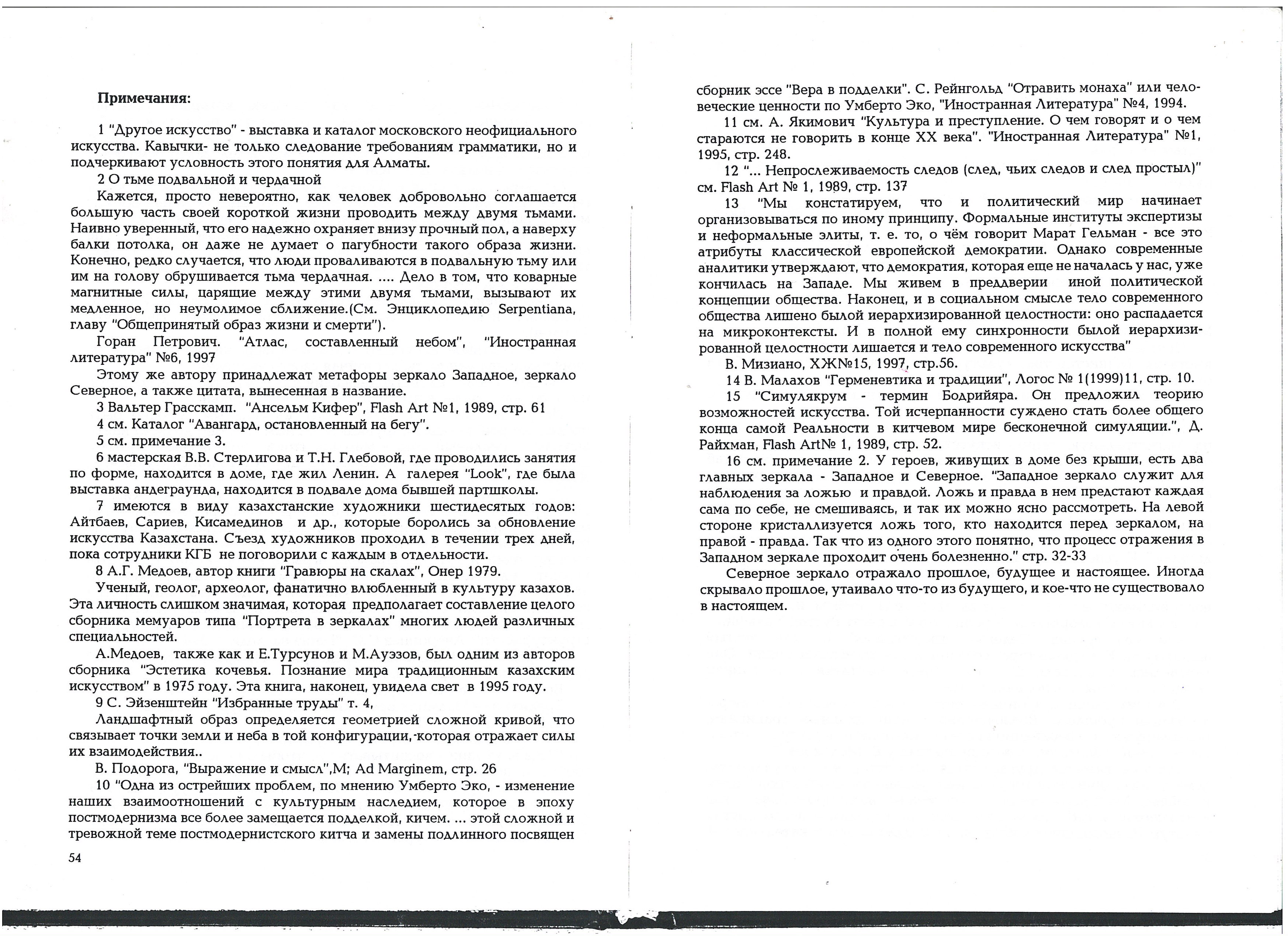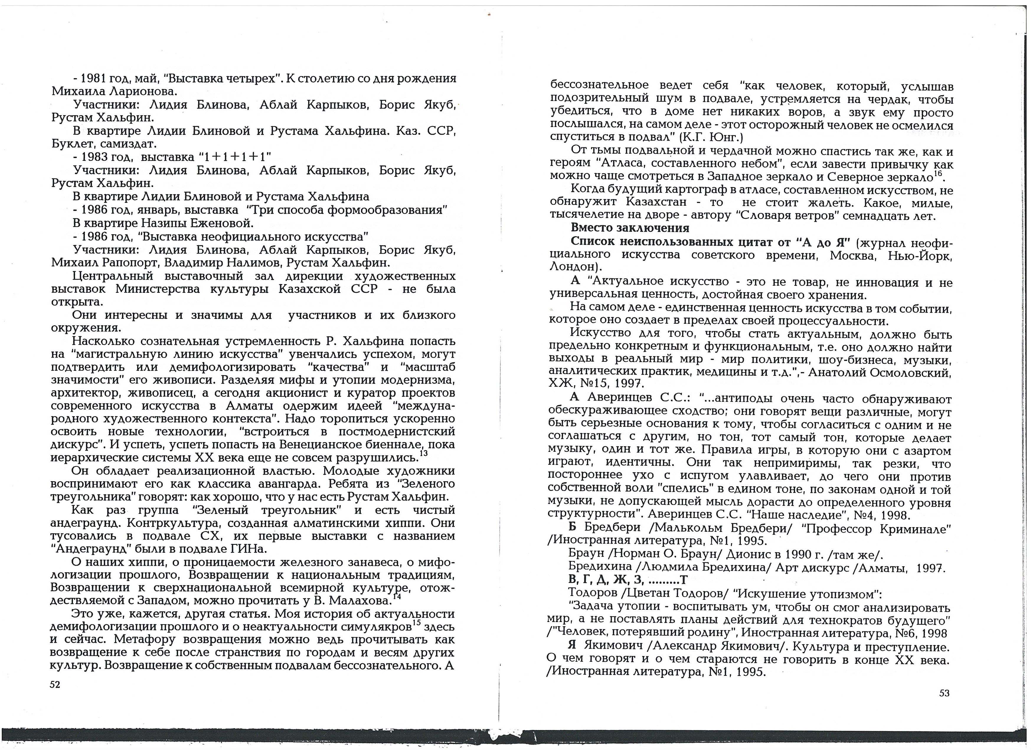 Averintsev Sergey, Aitbaev Salikhitdin, Antonenko Anna, Auezov Mukhtar, Baldano Serengeb, Bekhteev Vladimir, Blinova Lida, Baudrillard Jean, Boyce, Brown Norman O., Bradbury, Malcolm, Bredikhina, Lyudmila, Bruskin, Grisha, Buchinskaya, V., Voinov, Vladimir, Glebova, Tatyana, Grasskamp, Walter, Green Triangle Group, Dodge, Norton, Drevin Alexander, Ezhenova Nazipa, Zhegin Lev, Zaltsman Pavel, Zubkov Gennady, Ignutov Vladimir (pseudonym of Khalfina Rustam?), Itkind Isaac, Ishchenko Alexander, Kalmykov Sergey, Karpykov Ablay, Kisamedinov Makum, Kiefer Anselm, Larionov Mikhail, Malakhov V., Malevich Kazimir, Medoev Alan, Mitrokhin Dmitry, Nalimov Vladimir, Ordabaev Almas, Osmolovsky Anatoly, Petrovich Goran, Podoroga Valery, Daran (Reichman) Daniil, Rapoport Mikhail, Redko Kliment, Reingold S., Rozanova Olga, Rorokin Alexander, Sariyev Shaimardan, Cezanne Paul, Sterligov Vladimir, Todorov Tsvetan, Triakin-Bukharov Georgy, Tumanyan Yuri, Tursunov Ermek, Udaltsov Nikolai, Robert Falk, Pavel Filonov, Pavel Florensky, Rustam Khalfin, Vasily Chekrygina, Alexander Cherepanov, Sergei Eisenstein, Umberto Eco, Carl Gustav Jung, Alexander Yakimovich, Boris Yakub.