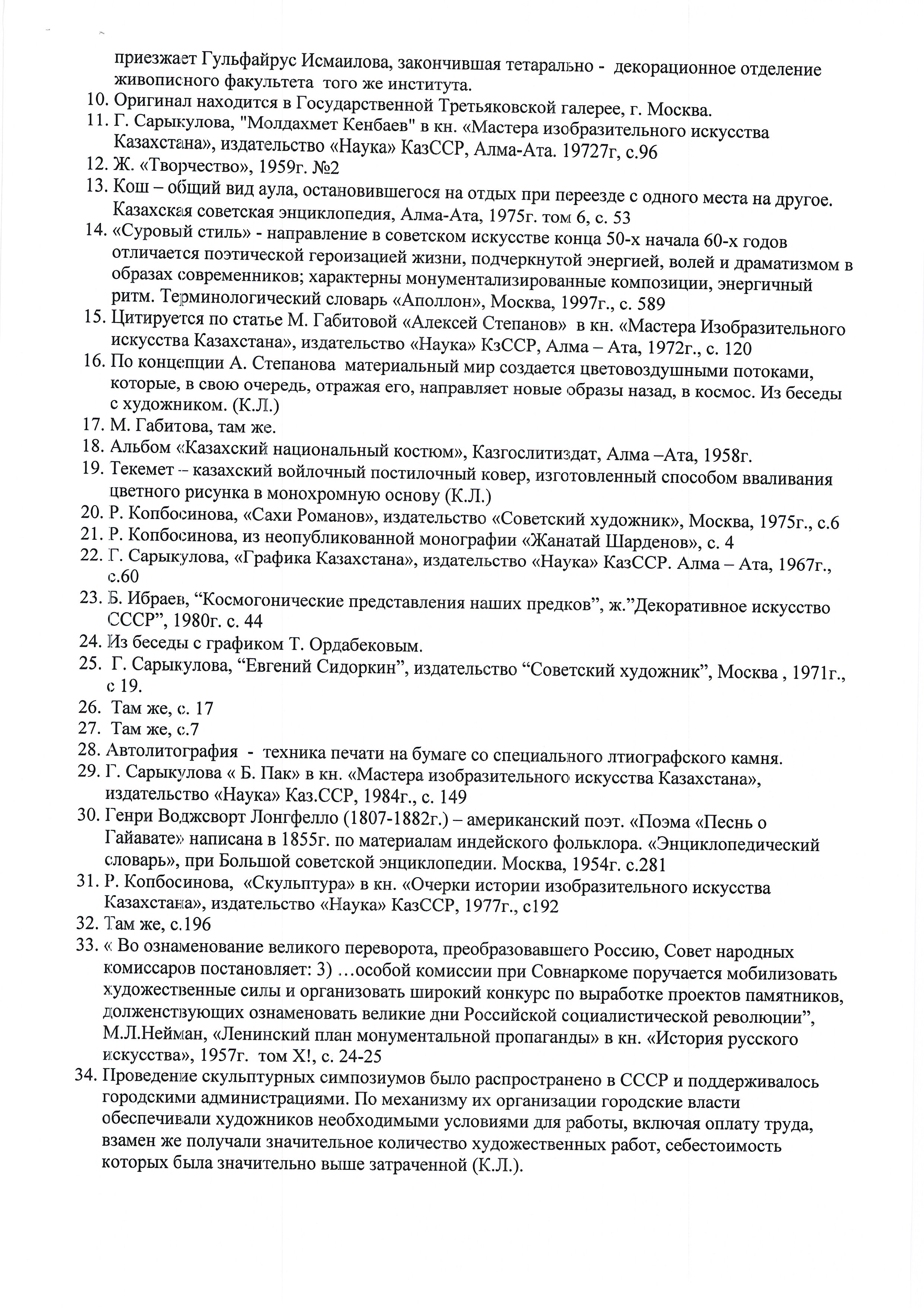 Andriyuk, P. "Drilling Tower." 1958. Voinov, V. "Bio-bibliographical Dictionary of Artists (unfinished due to the author's death)." Gaev, N. "Memoirs of a Bolshevik (series)." 1960. Gaev, N. "Portrait of Abai." Gaev, N. "Portrait of Seifullin." Galimbaeva, A. "Girl-Dzhigit." 1955. Galimbaeva, A. "Kazakh National Costume (artistic and ethnographic material for an album)." Galimbaeva, A. "Kegen." 1957. Galimbaeva, A. "Folk Talents." 1957. Galimbaeva, A. "Kumis Cup." 1967. Galimbaeva, A. "Portrait of Master B. Basenova." 1958. Galimbaeva, A. "Poem of Love." 1954. Galimbaeva, A. "The Path of Abai." 1949. Dosmagambetov, T. "Monument to Alibi Dzhangildin." Dosmagambetov, T. "Monument to Chokan Valikhanov (Kokshetau)." Ismailova, G. "Portrait of G. Eralieva as Karagoz." 1982. Kasteev, A. "Portrait Born from Nothingness." Kenbaev, M. "Horse Hunting." Krylov, V. "Karaganda is Being Built." 1958. Leontiev, L. "Carpet Weavers." 1949. Leontiev, L. "Kuibyshev and Frunze." 1982. Leontiev, L. "Leningrad During the War." Leontiev, L. "Night Threshing." 1946. Lyzogub, M. "Eternity." 1967. Lyzogub, M. "Dawn." 1964. Lyzogub, M. "Fairy Tale." 1958. Lyzogub, M. "Youth." 1957. Mambiev, S. "In the Mountains." 1957. Mambiev, S. "In My City." 1960. Mambiev, S. "Departure." 1959. Mambiev, S. "Female Students." 1959. Mambiev, S. "At the Yurt." 1958. Naurzbaev, Kh. "Kurmangazy." Naurzbaev, Kh. "The Boy Jambul." 1957. Naurzbaev, Kh. "Monument to Abay Kunanbayev." Naurzbaev, Kh. "Monument to Chokan Valikhanov." Naurzbaev, Kh. "Portrait of Amangeldy." 1958. Naurzbaev, Kh. "Poetess Mariam Hakimzhanova." 1963. Naurzbaev, Kh. "Saken Seifullin." 1965. Nurmukhammedov, N. "On the Kazakh magnetite." Pak, B. "Watercolor illustrations for Andersen's fairy tales." 1981. Pak, B. "Alatau (series)." 1969. Pak, B. "Cyclists." 1980. Pak, B. "Movement – Weightlessness (series)." 1980. Pak, B. "The Song of Hiawatha (illustrations for Longfellow's book)." 1984. Pak, B. "Sary-Arka." 1972. Rittich, A. "28 Panfilov Guardsmen." Romanov, S. "The Road of Life." 1959. Romanov, S. "We Live Here (film)." 1957. Romanov, S. "Traces Disappear Beyond the Horizon." 1962. Romanov, S. Forty Tales. 1955. Sarykulova, G. Masters of Fine Arts of Kazakhstan (monographic series). Sergebaev, E. Monument to Mukhtar Auezov (in front of the Kazakh Drama Theater named after Mukhtar Auezov). Sidorin, E. Illustrations for the first volume of Kazakh Epic. Sidorin, E. Kyrgyz Tales. 1965-1968. Sidorin, E. The Way of Abai. 1970. Sidorin, E. Reading Saken Seifullin. 1964. Telzhanov, K. "Grandmother Amina." 1955. Telzhanov, K. "For the First Time." 1954. Telzhanov, K. "Zhamal." 1955. Telzhanov, K. "Kok-Par." 1960. Telzhanov, K. "On the Land of Grandfathers." 1958. Tulekov, B. "Motherhood (composition)." 1971. Tulekov, B. "Monument to Alibi Zangelin (not installed)." 1978. Tulekov, B. "Monument to Chapaev in the city of Uralsk." 1982. Khaidarov, A. "The Last Seconds." Khaidarov, A. "Why Does a Swallow Have a Horned Tail?" Khodzhikov, S. "Kyz Zhibek (artistic staging of a historical film epic)." Cherkassky, A. "Dzhambul Dzhabaev and Dina Nurpeisova." 1946. Cherkassky, A. "Noon." 1957. Cherkassky, A. "Portraits of Heroes of the Soviet Union."