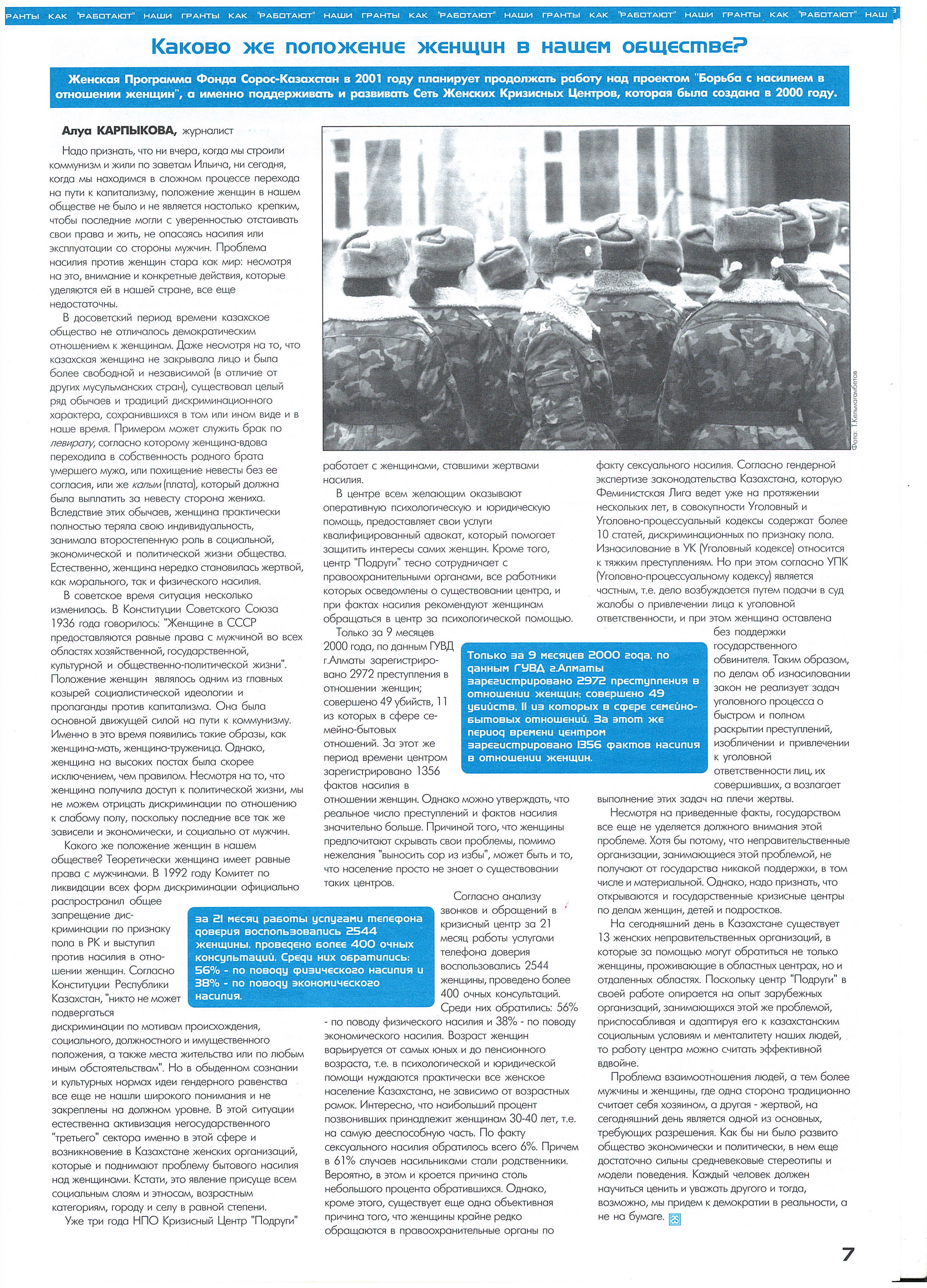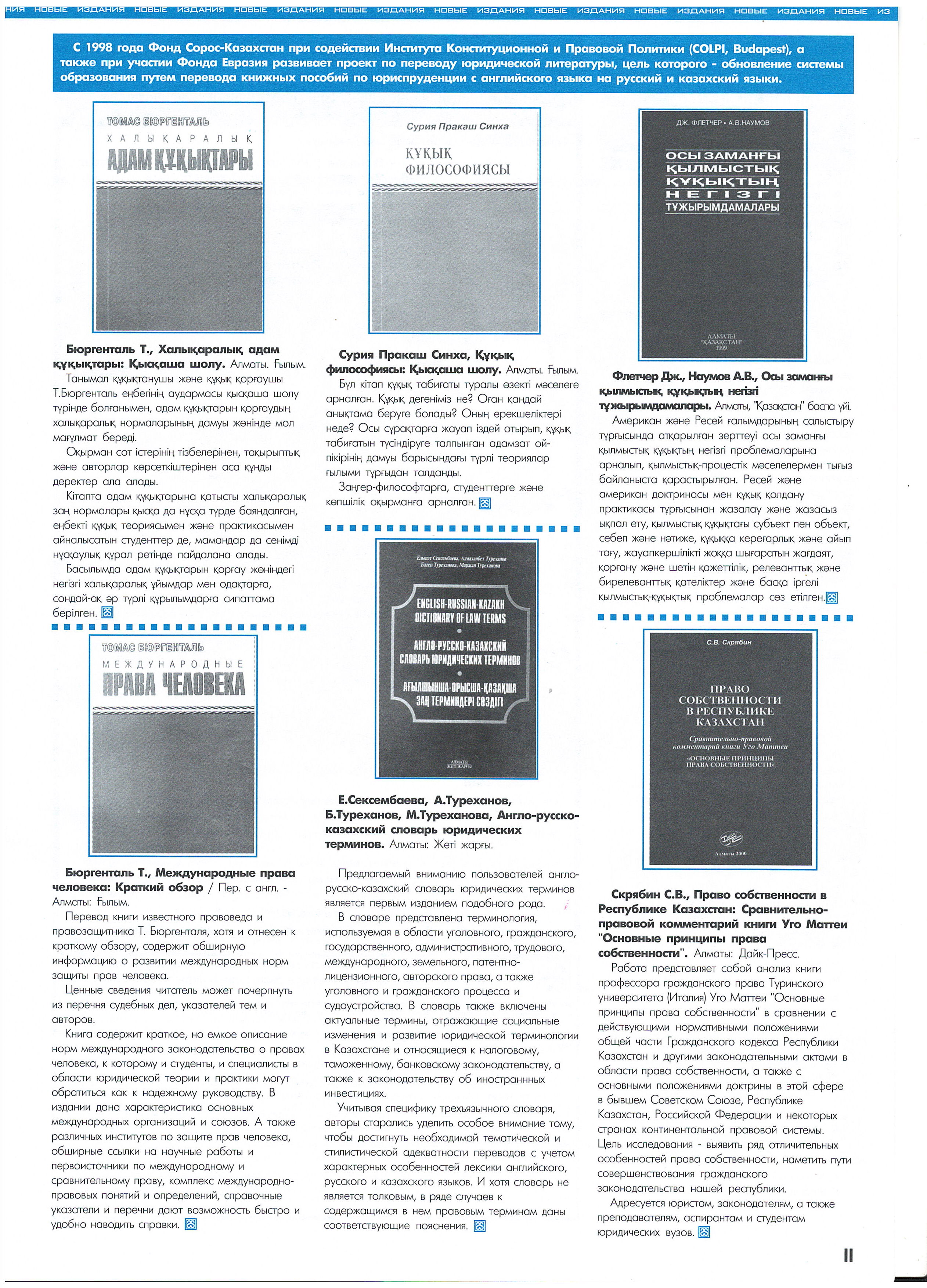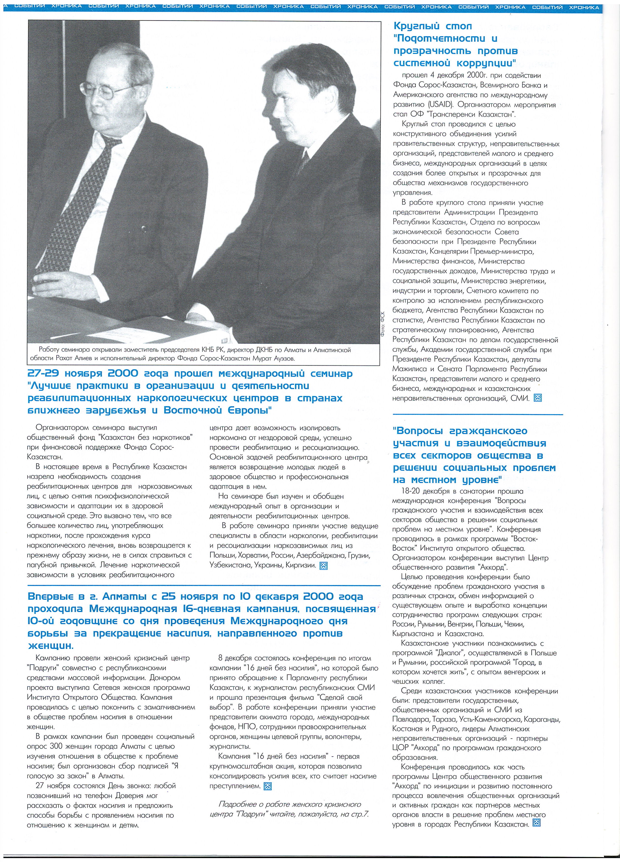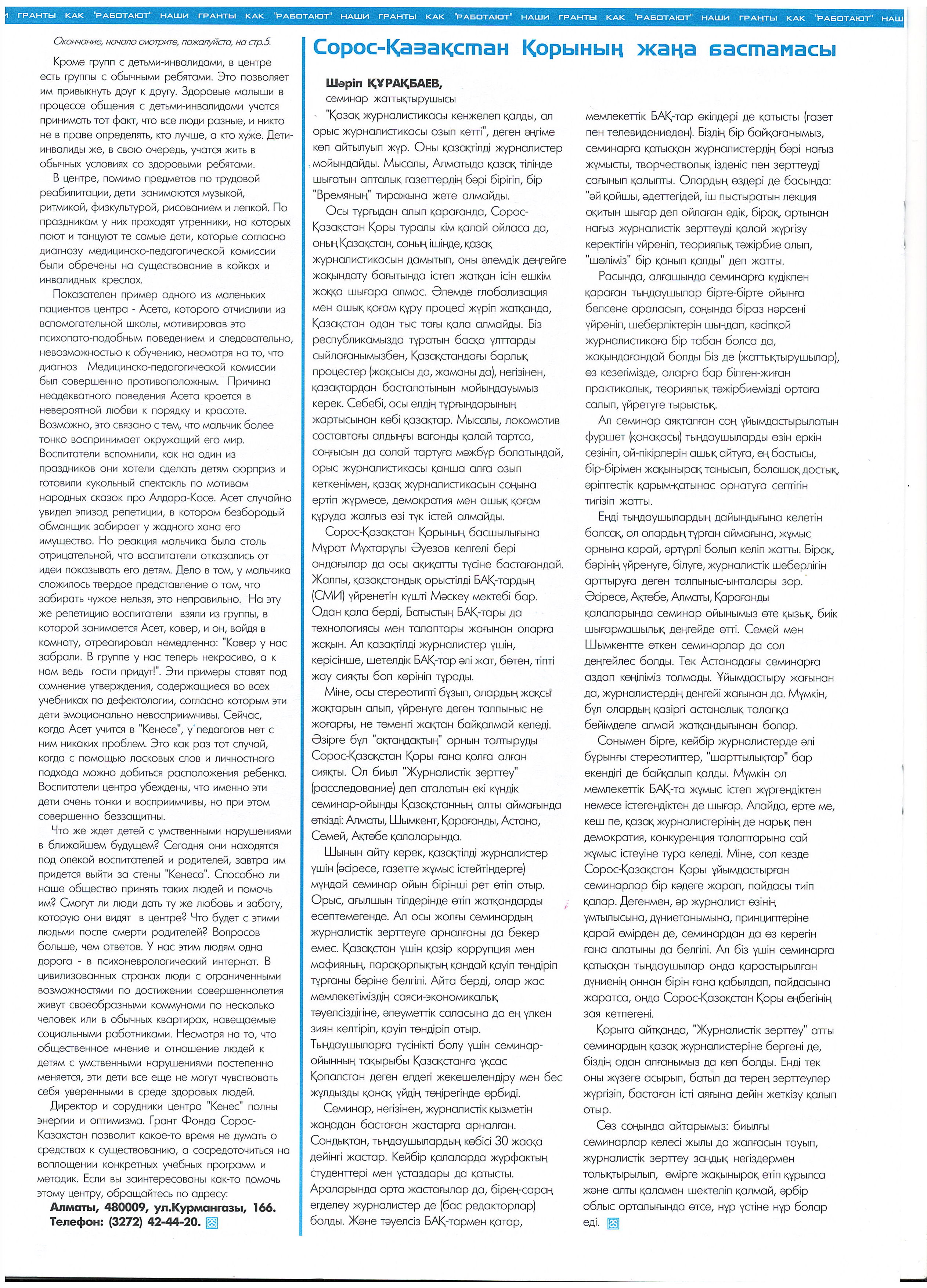 "3rd National Conference 'The Influence of the Community on the Development of Democracy in Educational Institutions.'" Conference. Almaty. 2000. Soros-Kazakhstan. "Journalistic Investigation." Almaty, Shymkent, Karaganda, Astana, Semey, Aktobe. 2000. Soros-Kazakhstan Foundation, Ministry of Education and Science of the Republic of Kazakhstan. "Educational Policy: Dialogue with Society." Seminar. 2000. Soros-Kazakhstan Foundation. "Combating Violence Against Women." 2000-2001.