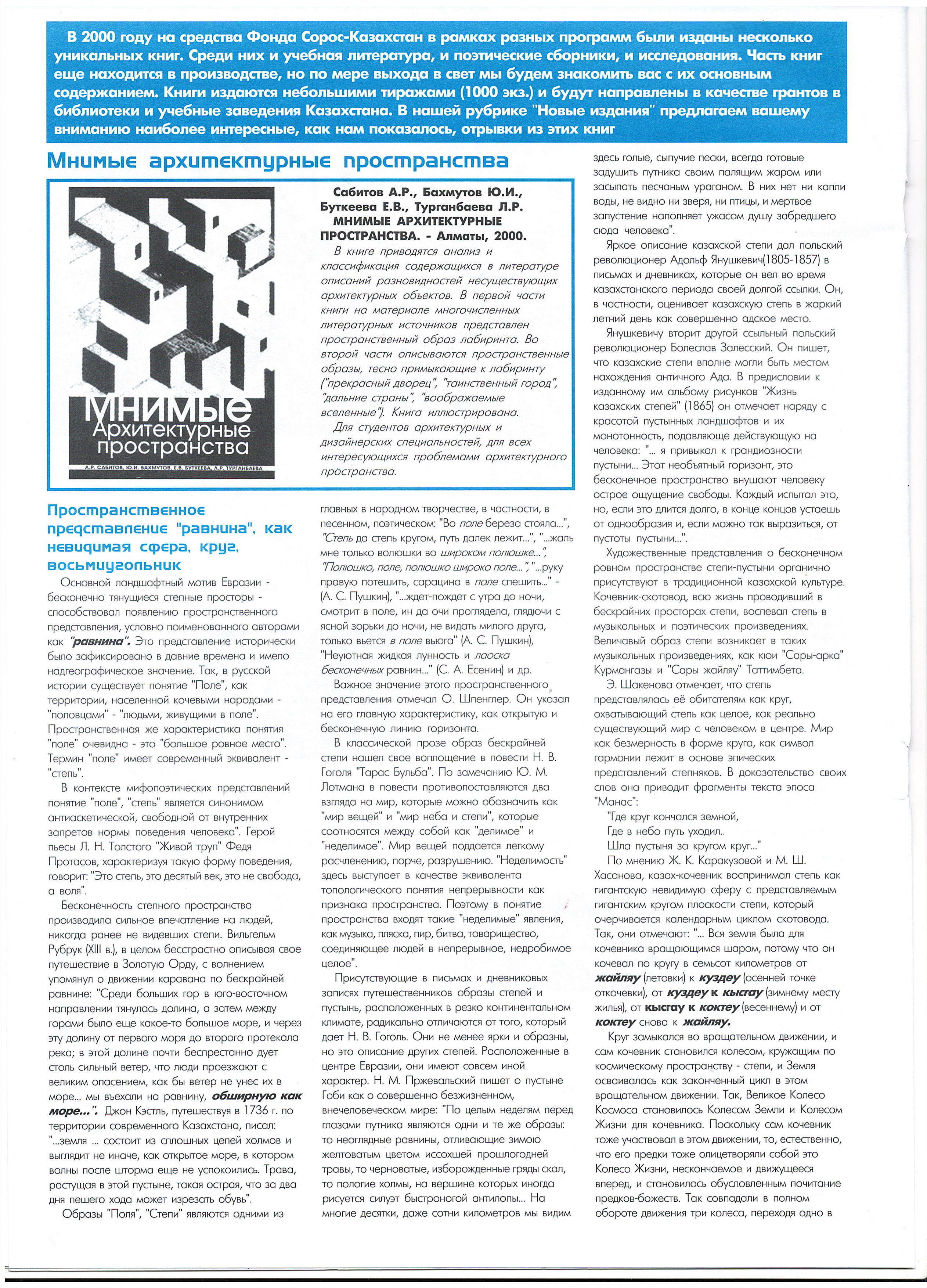 Author unknown. "Imaginary Architectural Spaces." 2000. Zaleski, B. "Life in the Kazakh Steppes." 1865. Kazangapuly, T. "Sary Zhaylau." Karpykova, A. "All Children Are Loved, All Children Are Equal..." 2000. Karpykova, A. "What is the position of women in our society?" 2000. Poluyakhtov, I. "Between Kharms and Ryadov (The Literary Experience of Nurlan Sultanbaev)." 2000. Sabitov, R., Bakhmutov, Yu., Butkeeva, E., Turghanbaeva, L. "Imaginary Architectural Spaces." 2000. Sagyrbayuly, K. "Sary-arka." Sultanbaev, N. "Hush, Creations!" 2000.