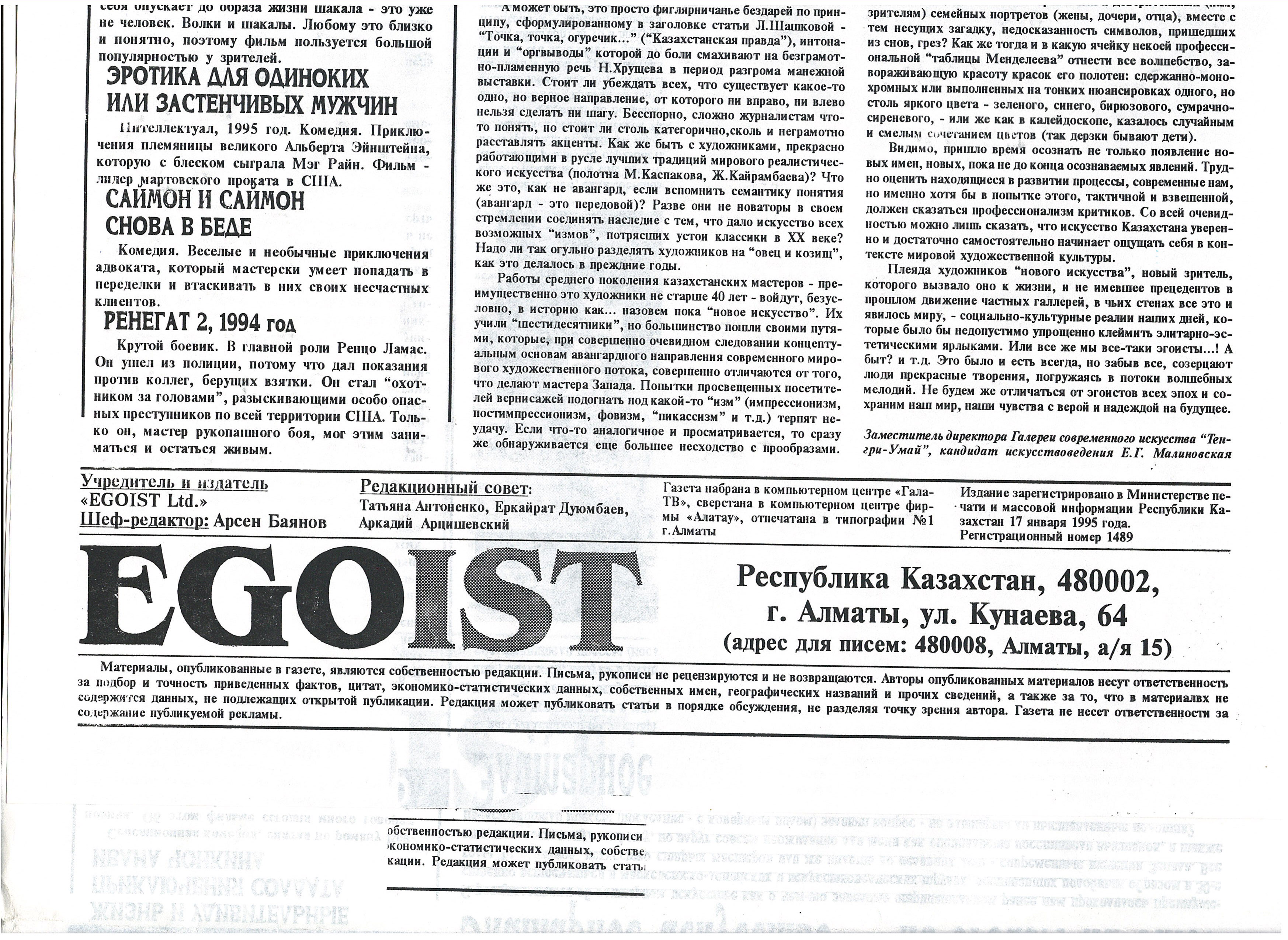 Малиновская, Е. «Элитарное искусство - не эгоизм ли это?». 1995.